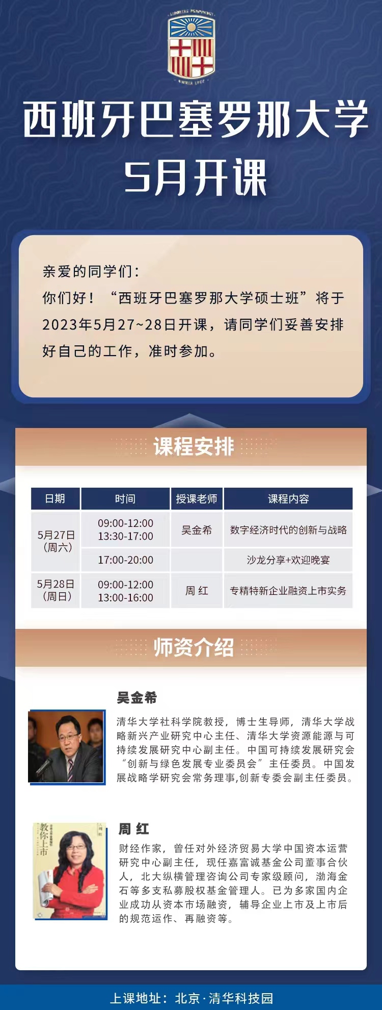 你們好!“西班牙巴塞羅那大學碩士班”將于2023年5月27~28日開課,請同學們妥善安排好自己的工作,準時參加。